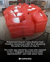 A hawker stall called Muhammad Shazain Faiha Muslim Food Paradise at Tiong Bahru Market was contacted by someone claiming to be an SAF (Singapore Armed Forces) representative who placed a large order for 150 packets of chicken and mutton biryani. The scammer told the hawker he couldn’t provide a deposit because “the military is a government agency and therefore cannot provide a deposit.”