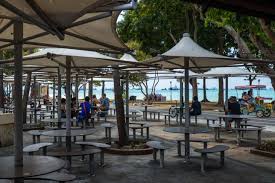 East Coast Lagoon Food Village Affordable hawker centre featuring grilled seafood, BBQ chicken, satay, sambal stingray, and fresh coconuts.