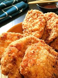 - Gently lower breaded pork into oil
